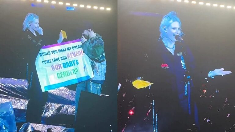 Primeiramente, entre uma música e outra, a vocalista Emily Armstrong avistou um cartaz escrito: “Você realizaria meu sonho e revelaria o sexo nosso bebê?”. Logo após, ela recebeu um envelope entregue pela fã e sem hesitar, abriu o papel e anunciou: “É uma menina! Parabéns!”, fazendo a plateia vibrar.