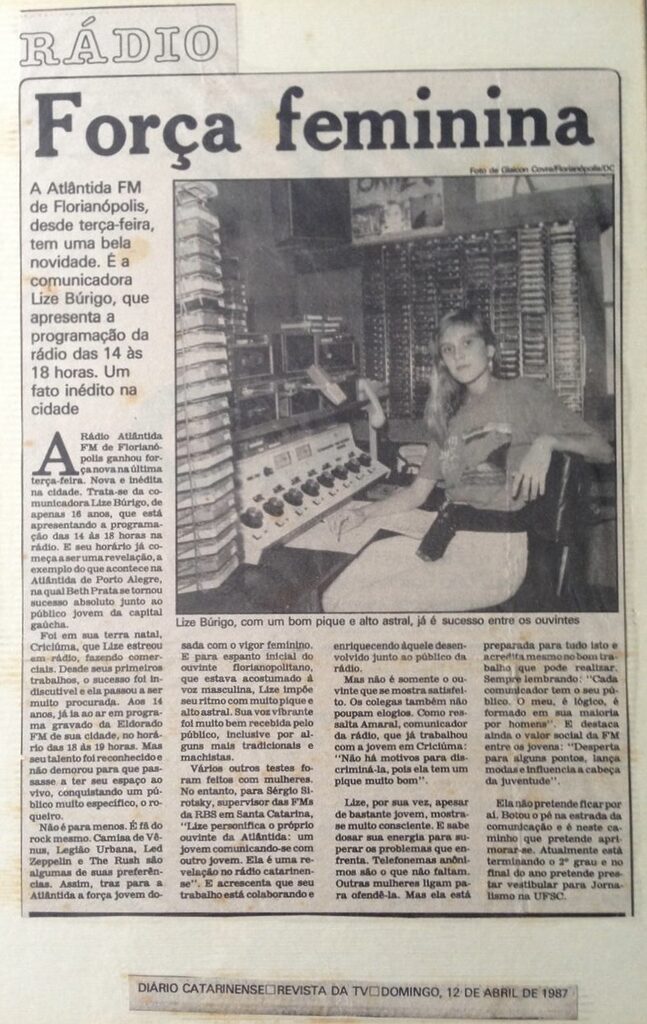 Lize Búrigo foi a primeira voz feminina da Atlântida em Santa Catarina. Iniciou sua trajetória na Rádio Atlântida FM de Florianópolis, em 1987, quando tinha apenas 16 anos. Naquele período, Lize estreou em rádio, gravando comerciais escondida dos pais. Inclusive, Seu primeiro comercial foi para a uma sorveteria em Criciúma, sua cidade natal. Naquela época, a FM era novidade no Brasil e seguia a linha de um som mais limpo e com mais entretenimento.